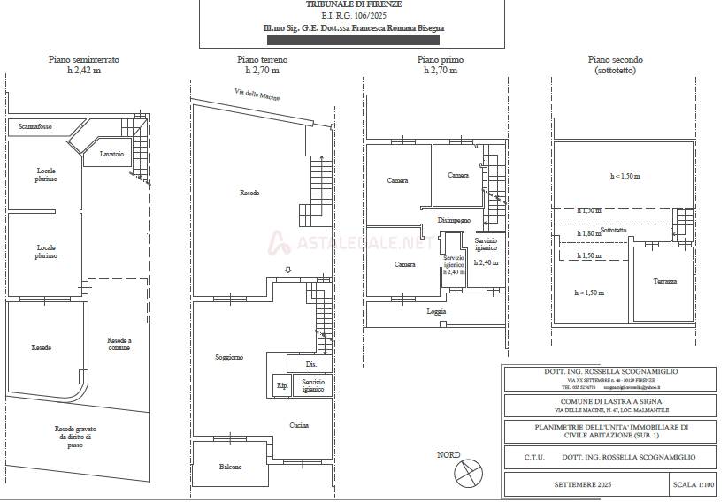 Nel comune di Lastra a Signa, via delle Macine 47, si trova in vendita IN ASTA un terratetto su tre piani fuori terra e piano seminterrato, facente parte di un più ampio fabbricato, composta al piano terra da resede ed al suo interno da soggiorno, cucina, dispensa, terrazzo, antibagno e bagno, al piano primo da disimpegno, tre camere di cui una con terrazzo e due bagni, il piano sottotetto è composto da zona centrale termica, al piano seminterrato è presente una zona lavanderia, un bagno e due vani.